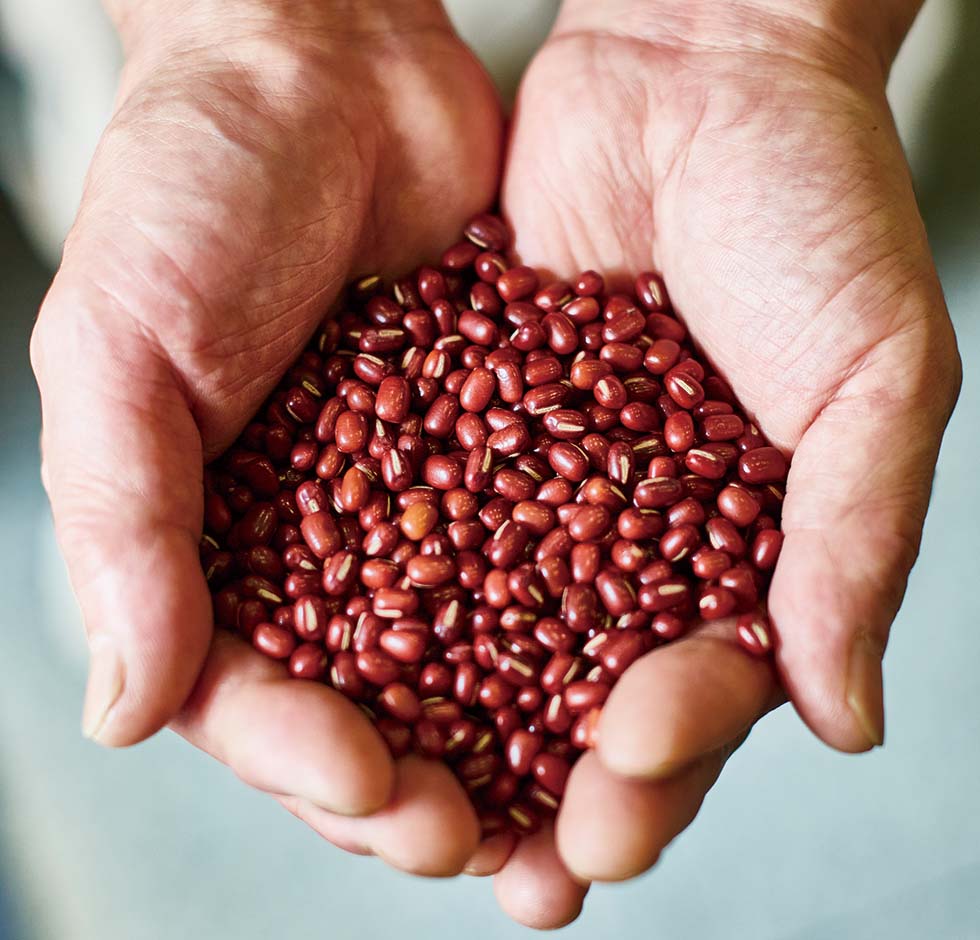 粒の大きさや色などで厳選した北海道産小豆のみを使用。香りが高く粒が大きいのが特徴で、その上品な甘みや風味を活かすため、餡子は甘さ控え目に仕上げている。