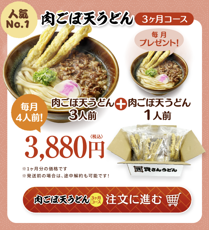 【めん】 小麦粉(国内製造)、食塩、(一部に小麦を含む)【肉うどんの具】牛肉(アメリカ産)、玉ねぎ、砂糖、しょうゆ、濃縮つゆ(食塩、砂糖、たん白加水分解物、みりん、しょうゆ、いわし煮干し粉末、うるめいわしぶし粉末、醸造酢、さばぶし粉末、かつおぶし、乾燥昆布、しいたけエキス、昆布粉末)/ 調味料(アミノ酸等)、酒精、カラメル色素、甘味料(甘草、アセスルファムK、ソーマチン)、(一部に小麦・大豆・牛肉・さば・大豆を含む)【ごぼ天】ごぼう(中国産)、衣(天ぷら粉(小麦粉、とうもろこし粉、卵黄粉))、揚げ油(なたね油)/ 膨張剤、乳化剤、着色料(カロテン、V.B2)、(一部に小麦・卵・乳成分・大豆を含む)【濃縮つゆ】 食塩(国内製造)、砂糖、たん白加水分解物、みりん、しょうゆ、いわし煮干し粉末、うるめいわしぶし粉末、醸造酢、さばぶし粉末、かつおぶし、乾燥昆布、しいたけエキス、昆布粉末/ 調味料(アミノ酸等)、酒精、カラメル色素、甘味料(アセスルファムK、カンゾウ、ソーマチン)、(一部に小麦・さば・大豆を含む)