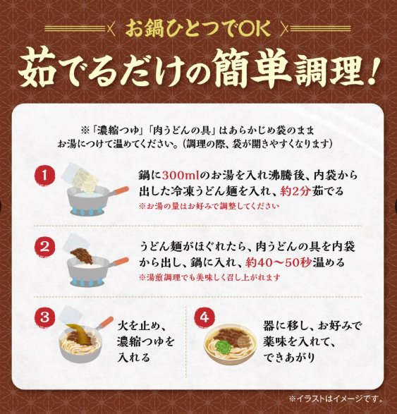 【肉うどんの具】牛肉(アメリカ産)、玉ねぎ、砂糖、しょうゆ、濃縮つゆ(食塩、砂糖、たん白加水分解物、みりん、